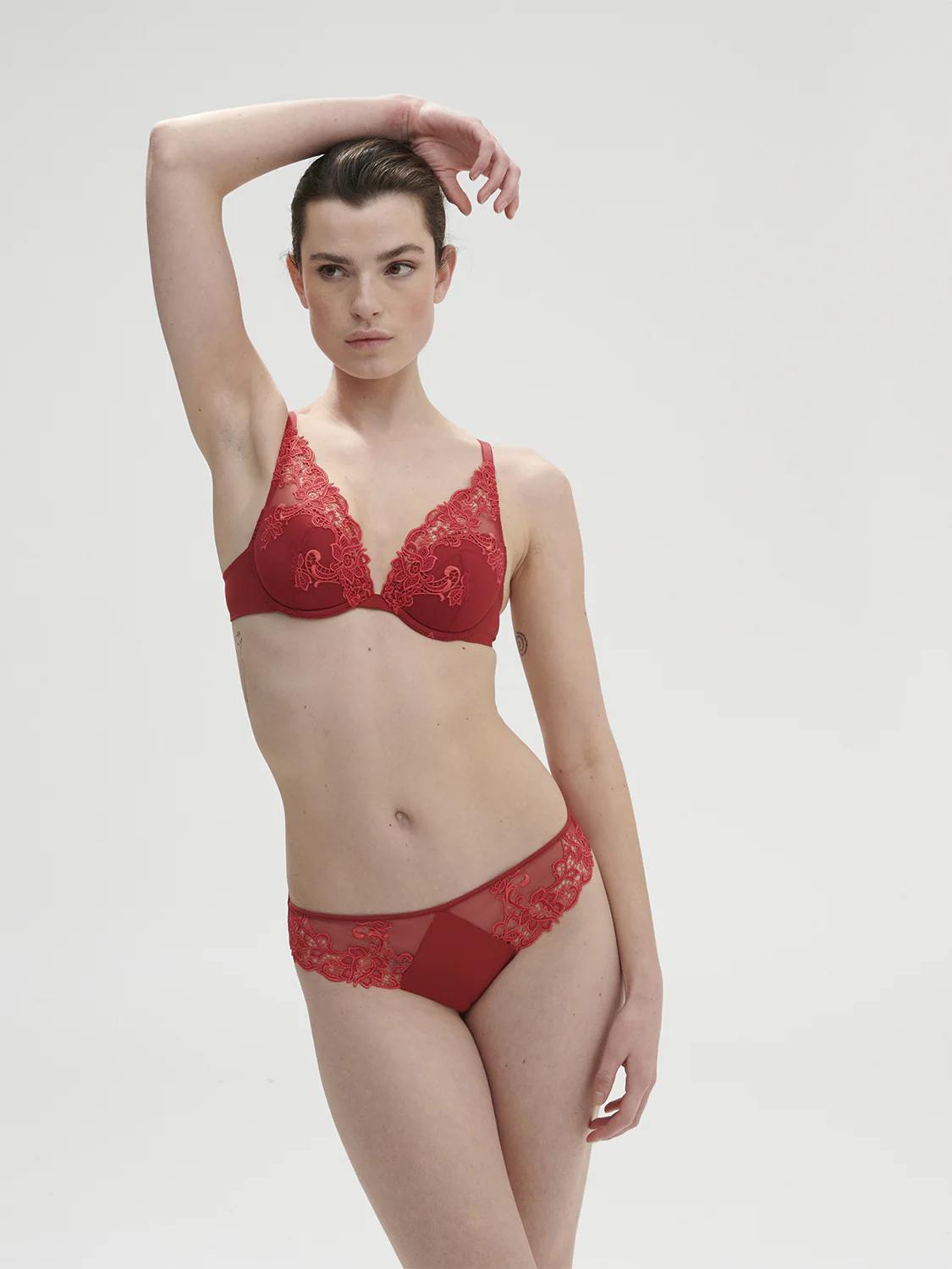 Ligne élégante où broderie et guipure se mêlent à la légèreté du tulle. Glamour et raffinée.