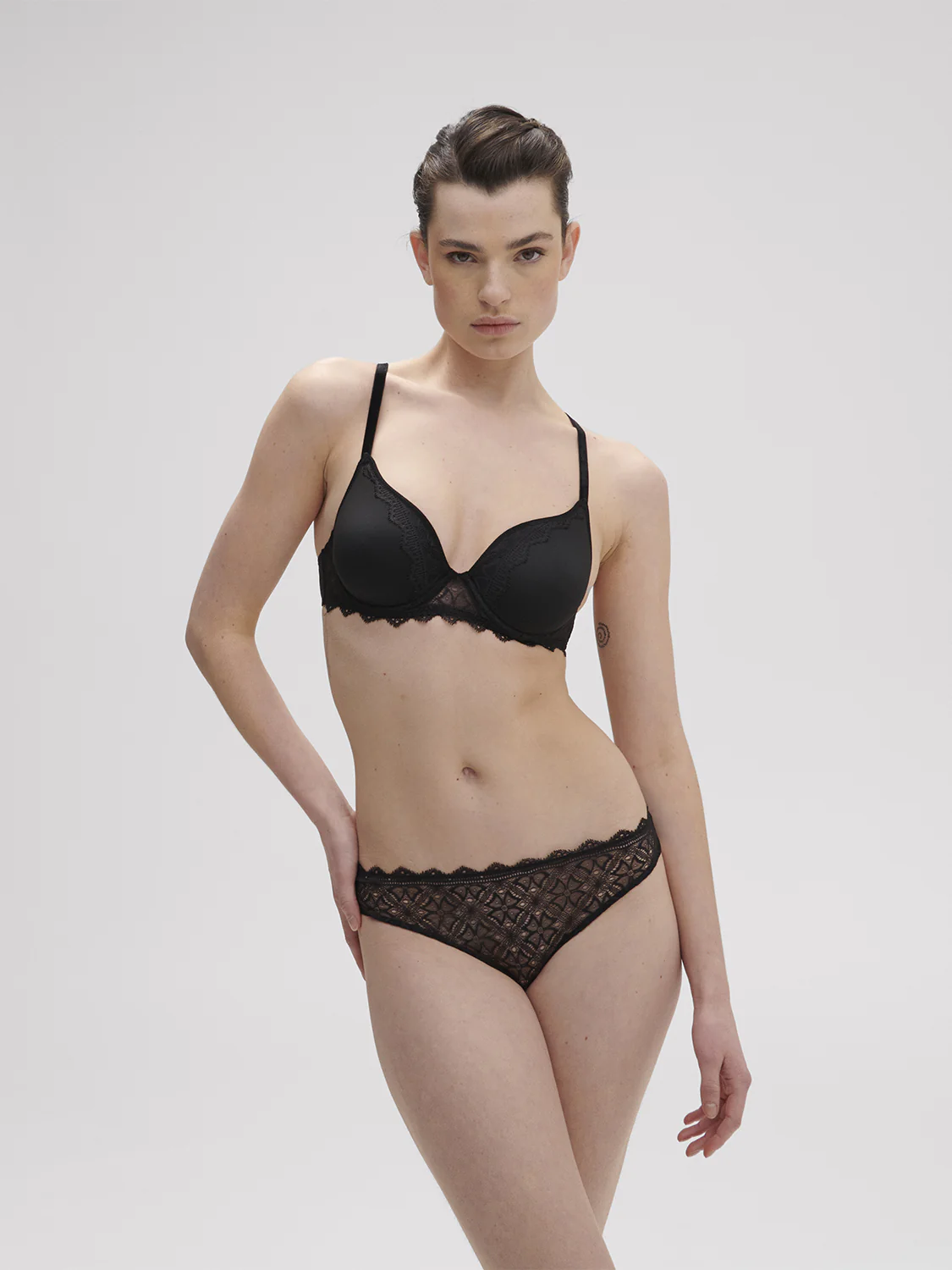 Une dentelle délicate aux motifs graphiques associée à une maille fine pour un quotidien tout confort. Moderne et daily.